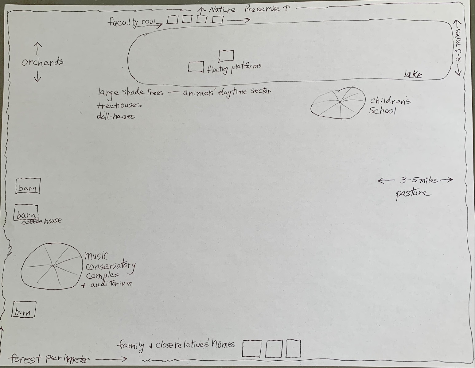 Elenchus: And here’s a revised layout for the farm. It’s all roughly conjured, of course, subject, likely, to constant modification as we get into things. Faculty row is now across the lake, backing into the nature preserve, and right at lakeside – some of the most picturesque settings on the entire farm. A children’s school is envisioned – I hope to invite Summerland’s “education dept” to locate one of their schools to be with us. I think the school kids would like the animals, tree-houses, doll-houses, and the lake. My family house is situated in the same place, but now with the possibility of closest relatives next door. The music conservatory promises to be a real hub of activity, more demanding than I first imagined, requiring the addition of many new faculty. And I’ve also allowed for the possibility of a third barn; we’ll know more about this as things progress.