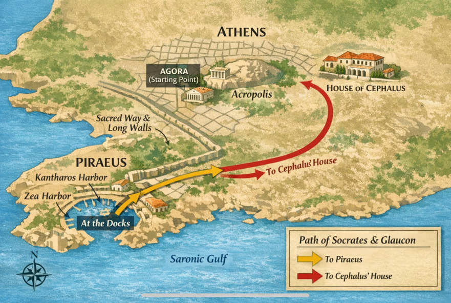 Begins at Cephalus’ house in Piraeus, near Athens; later discussions move into more abstract, philosophical space as the dialogue develops into the ideal city construction.