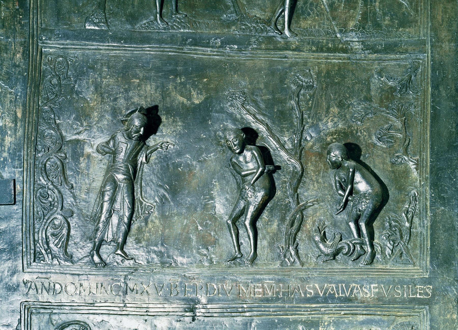 He offers a small example, a detail etched in burnished doors of the Church of St. Michael, Hildesheim, Germany.